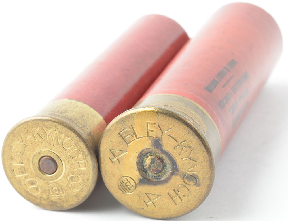 Lot of 2, ELEY-KYNOCH, 4ga & 8ga, both loaded red paper case with printing, TW BB & AAA shot. Grade: Excellent - Value: 50 to 300
