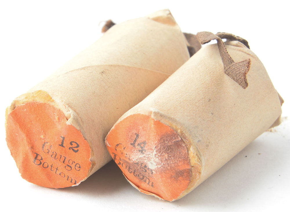 Lot of 2, Shot Concentrators. (1) ''12 Gauge Bottom'' on orange sticker, paper wrapped with black pull tab. (1) 14 Gauge, HS:''14 Gauge Bottom'' pm pramnge stiicker. Paper wrapped with black pul tab. Both by Eley. Grade Excellent. - Value: 20 to 40