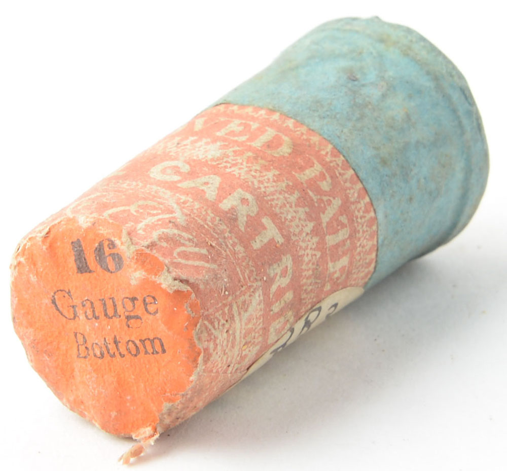 Early Eley's wire and concentrator shot loads. The Eley Brothers began designing shot in the 1820s in London and the company is still in business today and located in Birmingham. Civil Wire Paper wrapped Eley 16 gauge wire shot shell. Base of the cartridge is marked: 16 Gauge Bottom on an orange tag. Grade: Excellent - Value: 16 to 60