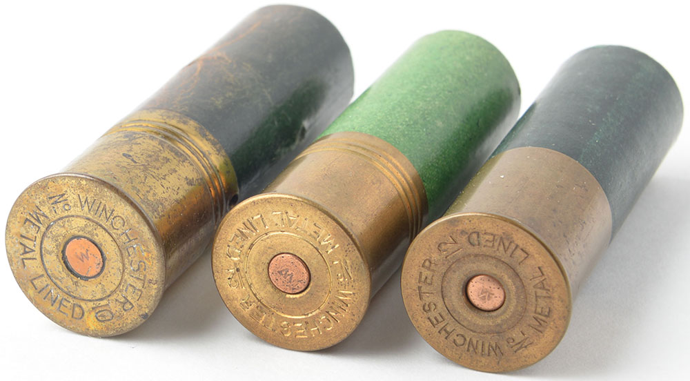 Lot of 3 Winchester Metal Lined one 10ga and two 12ga, all NPE, green, brown and black paper cases, 2 13/16'' OAL. Grade: Very Good ++ - Value: 10 to 60