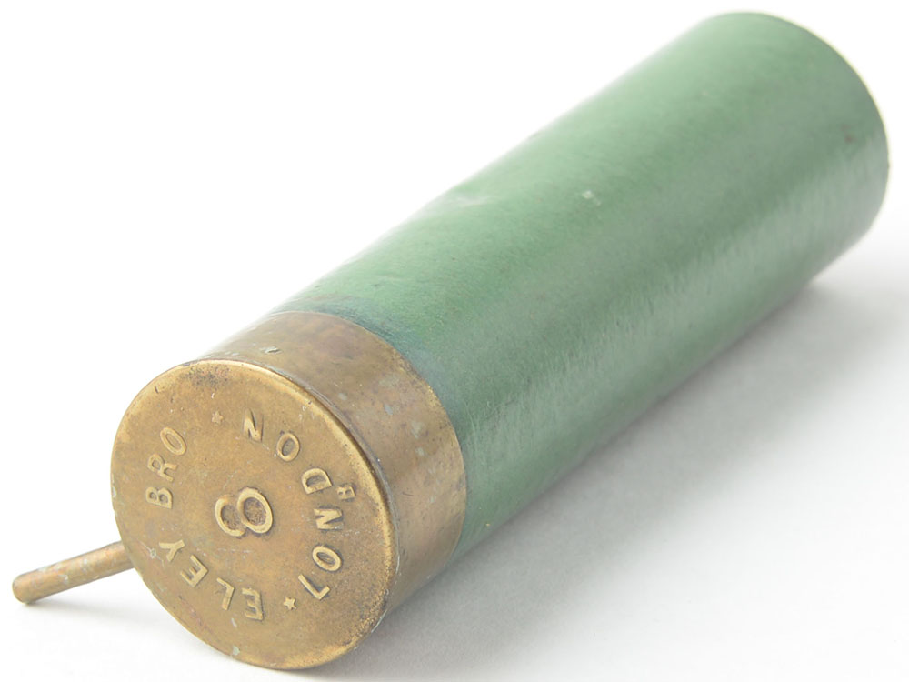 8 Gauge Pinfire. HS:''ELEY BRO LONDON 8 (in center)'', NPE case, Brass base & green paper case. Grade: Excellent - Value: 20 to 40