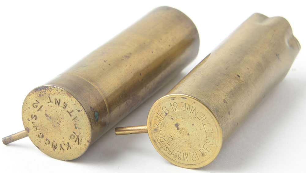 Lot of 2. 12 Gauge Brass Pinfire Shotshells. (1) HS:''KYNOCH 12 PATENT No'', NPE. (1) HS:''MBE FSE D'Armes 12 DESTETIENNE 12'', Wax wad. Grade: Very Good - Value: 20 to 40