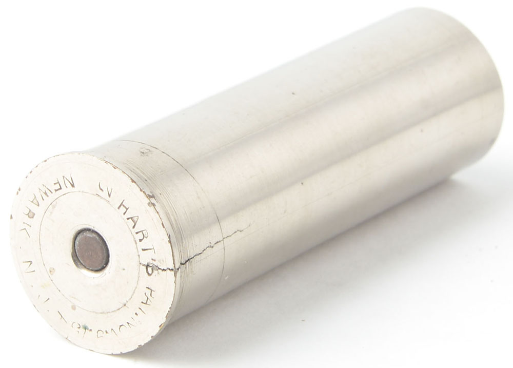 Harts Pat. Newark, N.J. 12ga, empty nickel plated shotshell, 2 9/16'' OAL. Grade: Very Good ++ - Value: 20 to 60