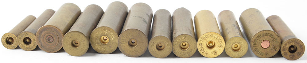 Lot of 12 empty brass shotshells. Grade: Very Good + - Value: 4 to 40