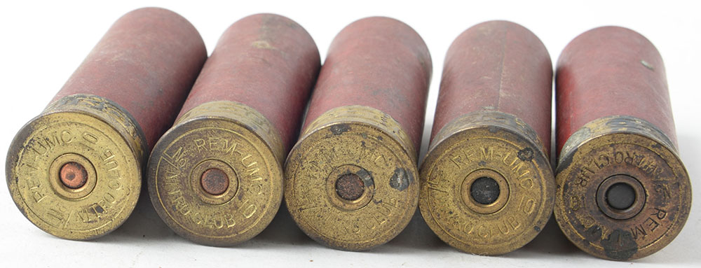 | Lot of 5 loaded shotshells, red paper cases, REM-UMC NITRO CLUB,...