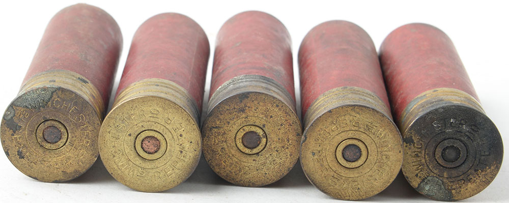 | Lot of 5 loaded shotshells, red paper cases, Winchester Repeater...