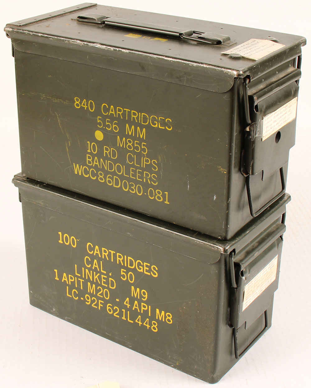 | Lot of two M2A1 .50 Cal metal ammo cans, both empty, insides of ...