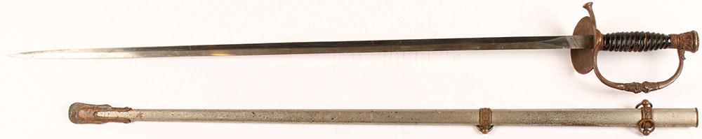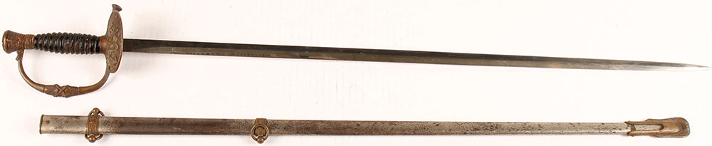 EA Armstrong Co., Grand Army of the Republic (G.A.R.), M1860 Officer dress sword with scabbard, This sword was made for a member of the Grand Army of the Republic (G.A.R.), a veteran's organization made up of Union Soldiers from the civil war. It has a GAR superimposed monogram on the shell guard, between a Naval Anchor on the left, and three stacked rifles on the right. Blade is acid etched on the left side ricasso ''THE E.A.'', ''ARMSTRONG'', ''CO'', ''DETROIT'', ''MICH''. The wire wrapped wood grips have some chips & has darked from hand oils over time. The brass guard & pommel have patinaed showing a brown copper-like color. The blade has light speckled dark patina. scabbard has speckled patina. Made circa 1880's. Grade: Very Good - Value: 200 to 400