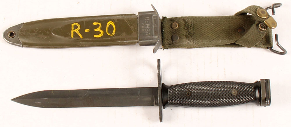 Bauer Ordnance Corp., M7 Bayonet with M8A1 sheath/hanger, checkered black grips, blade has use/sheath wear, top of guard marked ''US M7'', ''BOC'', sheath marked ''USM8A1'', ''PWH'' & marked with yellow paint ''R-30'' on both sides of sheath. Grade: Excellent - Value: 50 to 100