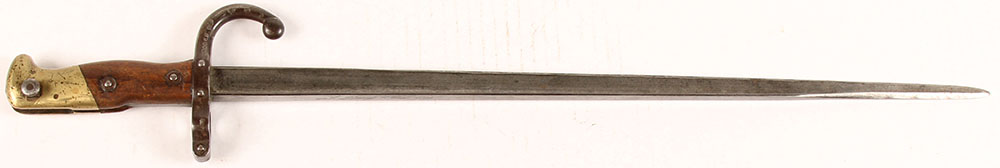 French, L. Deny Paris, M1874 Gras Bayonet, MFG 1881. Spine of blade marked in cursive ''L. DENY PARIS 1881''. Left side of guard marked with three circle proofs, cursive ''FM 83486''. Smooth wood grips, brass pommel, steel guard with quillon. Grips have dings & small chips, pommel has many small dings & spots of dark patina, guard has toned to a mix of dark patina & gun metal gray, blade is a mix of dark patina & gun metal gray, edge has a couple small dings near the tip. Grade: Very Good ++ - Value: 50 to 250