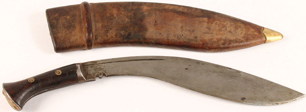 Indian, Qeyoom Bros, Mk.2 Kukri, with original hard leather sheath. Wood grips, grasping groove are almost worn smooth & not visible. Yellow paint on bottom of pommel. Left side of blade marked ''QEYOOMBROS'' Over ''94'', the first & last number of the date is worn away. Blade has only a couple small nicks, blade has spotty dark patina. The brass tipped leather sheath is stamped up by the throat ''COC1944'' over ''C'' British broad arrow ''840''. Sheath has some rubbing wear, dark stains, & a couple ripped seams on the backing. Grade: Very Good + - Value: 200 to 400