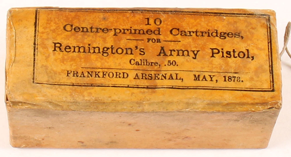 RARE!!, Frankford Arsenal, .50 Cal Remington army Pistol Cartridges, Benet primed, May 1878. 1pc, FULL & SEALED with opening string, buff box/label with black print, & covered in original protective lacquer. The box is solid with a small tear in the label on the right end, light age soiling, & light rubbing wear on the sides, top, bottom, edges & corners. Grade: Excellent - Value: 250 to 500