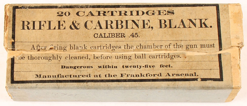 Frankford Arsenal, Rifle & Carbine Blanks, .45-70 Government, date stamped ''SEP 8 1903'', Full 20rds., ''U.S.C. CO. 45-70'' H/S, copper primer, 2pc. Buff box with gray label & black printing, box is solid with age soiling, small tear in top side label, & light rub wear on sides, edges/corners, ammo is good, cases have some corrosion sides. Grade: Very Good ++ - Value: 30 to 90