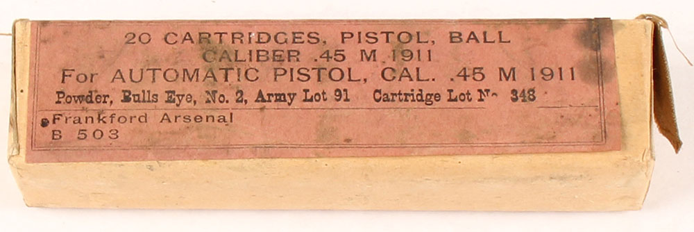 Frankford Arsenal, Cal. .45 M1911 Pistol Ball (.45 ACP), 20 Rd. ammo box, FULL & SEALED, 1pc, buff box with red label & black print, box is solid with age soiling spots, & light rub wear on labels & edges/corners. Grade: Excellent - Value: 10 to 30
