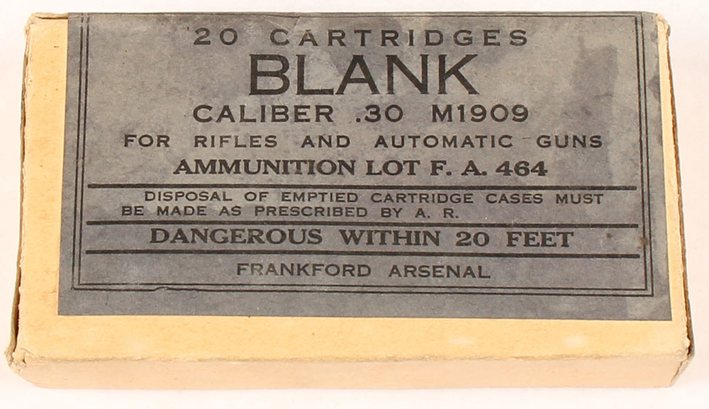 Frankford Arsenal, .30 M1909 Blank, Lot F.A. 464, FULL & SEALED, 1pc, buff box with blue label & black print, box is solid with light age soiling, some black stains on top label, & light rub wear on sides & corners/edges. Grade: Excellent + - Value: 20 to 40
