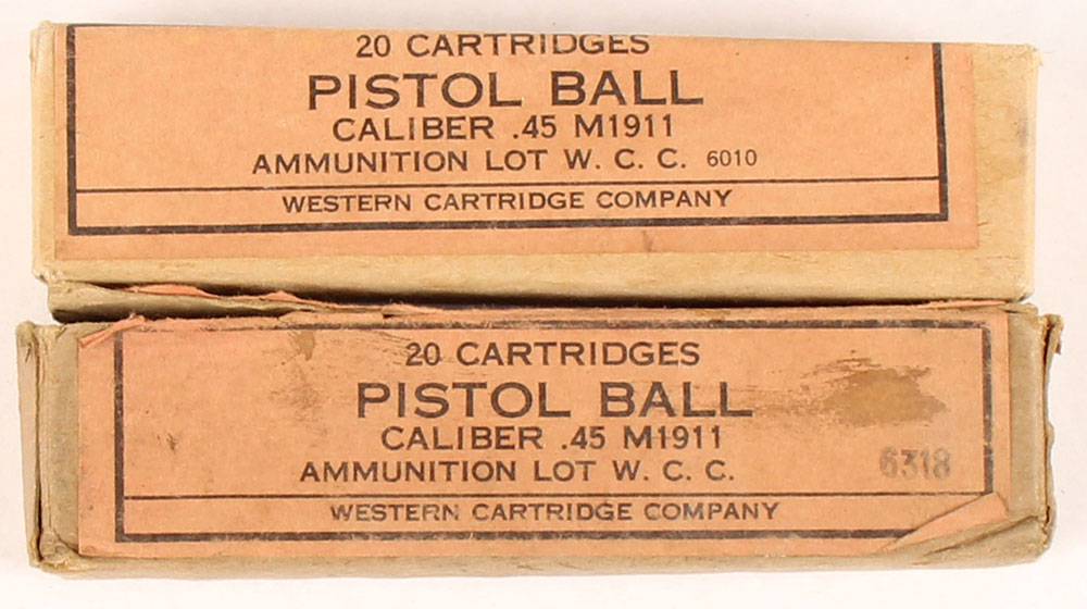 Lot of two, Western, .45 M1911 Pistol Ball (.45 ACP), one FULL & SEALED, one partial 17 Rds., buff boxes with re labels & black print, sealed box has pencil marks & light rub wear, partial box has age soiling, handling wear & rub wear on labels, edges, & corners, ammo in open box is very good. Grade: Very Good ++ - Value: 20 to 40