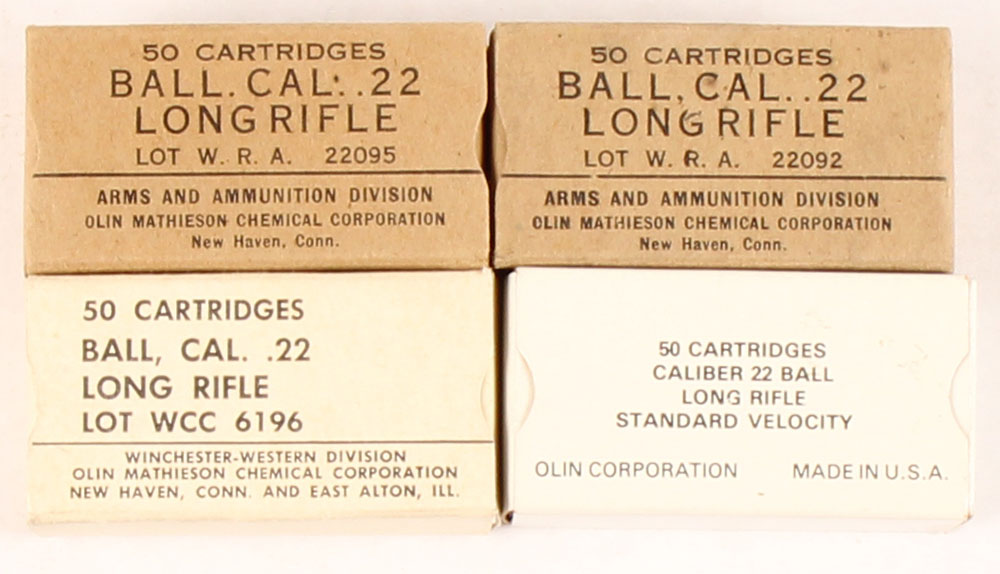 Lot of four, Winchester/Olin, .22 LR Ball, all full, 50 Rd. boxes, 1pc, boxes are solid with light rub wear, ammo is very good. Grade: Excellent - Value: 10 to 30