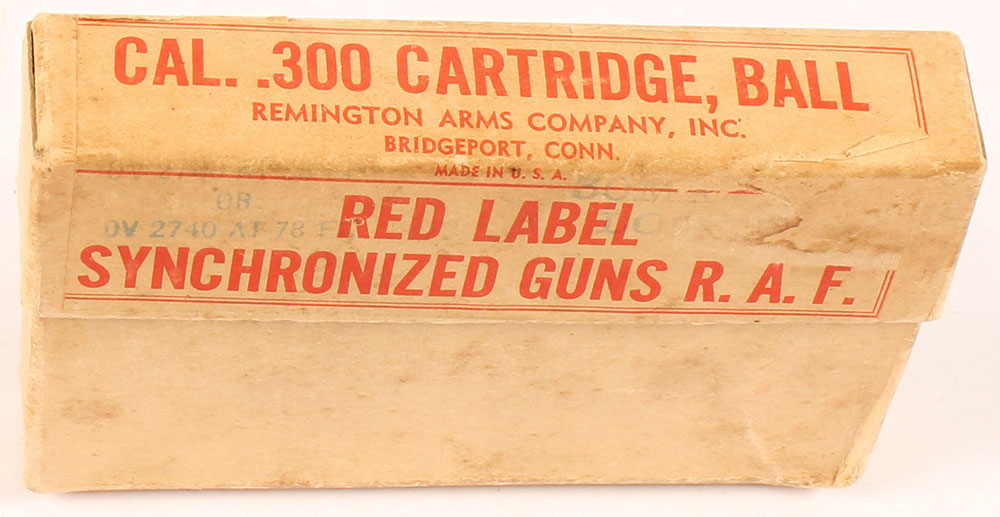Remington, .300 Cartridge Ball (.30-06), Red Label Synchronized Guns R.A.F., Full, ''RA 1941 300 Z'', 2pc, buff box & label with red print, box is solid with a tear in bottom, handling wear, rub wear on labels & edges/corners, tear on top right of front label, old stamp markings on right from label that are mostly faded away. Ammo is excellent. Grade: Very Good ++ - Value: 20 to 40