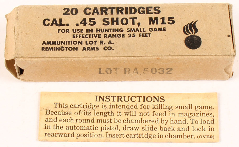 Remington, .45 M15 Shot cartridges (.45 ACP), Lot RA 5032, has instruction sheet inside, 1pc, Full., ''RA 4'' H/S, brown box with black print, box is solid with light handling wear, & light rubbing wear on labels & edges/corners, ammo is ranges from excellent to very good. Grade: Excellent + - Value: 20 to 40