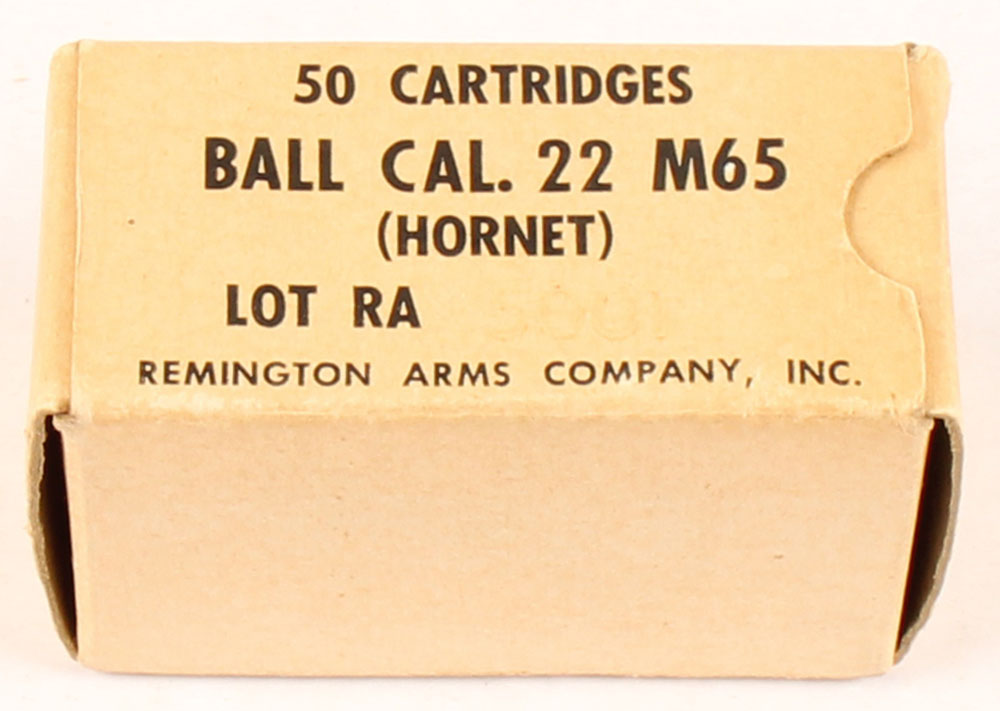 Remington, .22 Hornet, M65, Lot RA 5001, Full, ''RA 59'' H/S, 1pc. Buff box with black printing, box is solid with light age soiling & minor edge/corner wear, inside left flap stamped ''R26P'', ammo is excellent. Grade: Excellent + - Value: 30 to 50