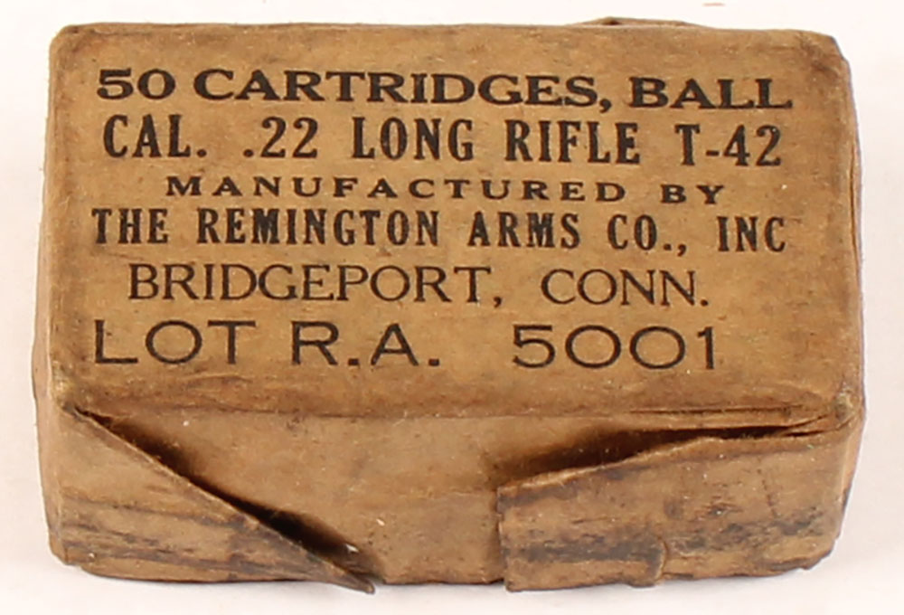 Remington, .22LR T-42, RA 5001, 1pc, foil wrapped box, FULL & SEALED, 1pc, brown wrapping has age soiling, light handling wear, & rub wear. This ammo was developed & made in WW2 for use with suppress high standard HDM pistol, the designation would later change to M24. Grade: Very Good + - Value: 20 to 100