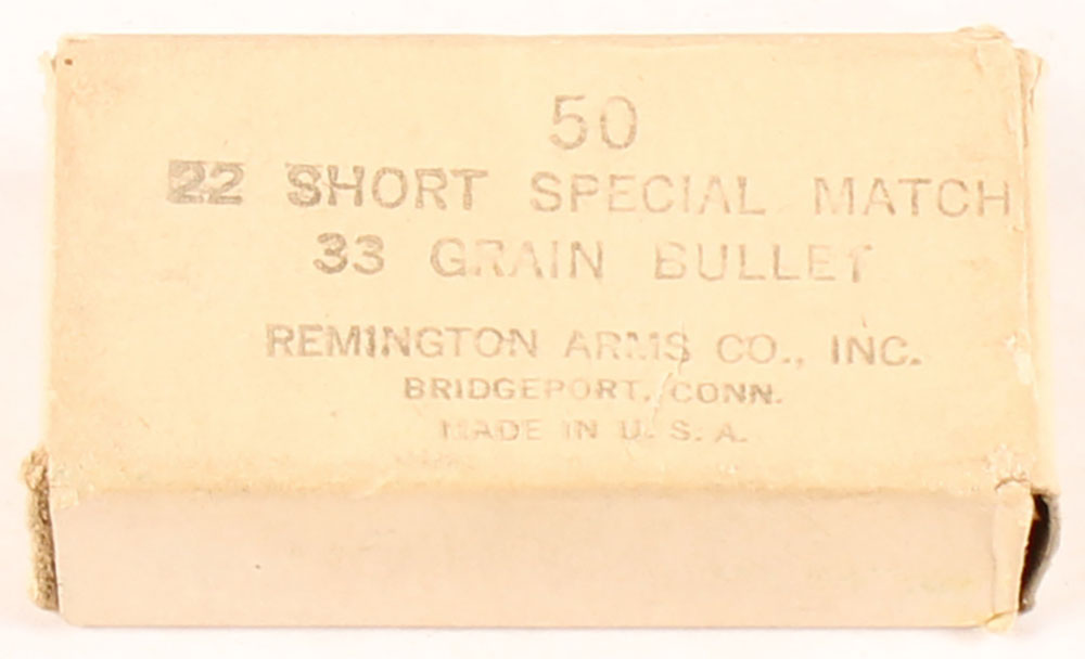 Remington, .22 short Special Match, 33 Grain bullet, full, ''U'' H/S, 1pc, white box with black print, box is solid with some fading to print, & light rub wear to labels & edges/corners, right inside flap stamped ''JOIP'', ammo is very good. Grade: Excellent - Value: 10 to 30