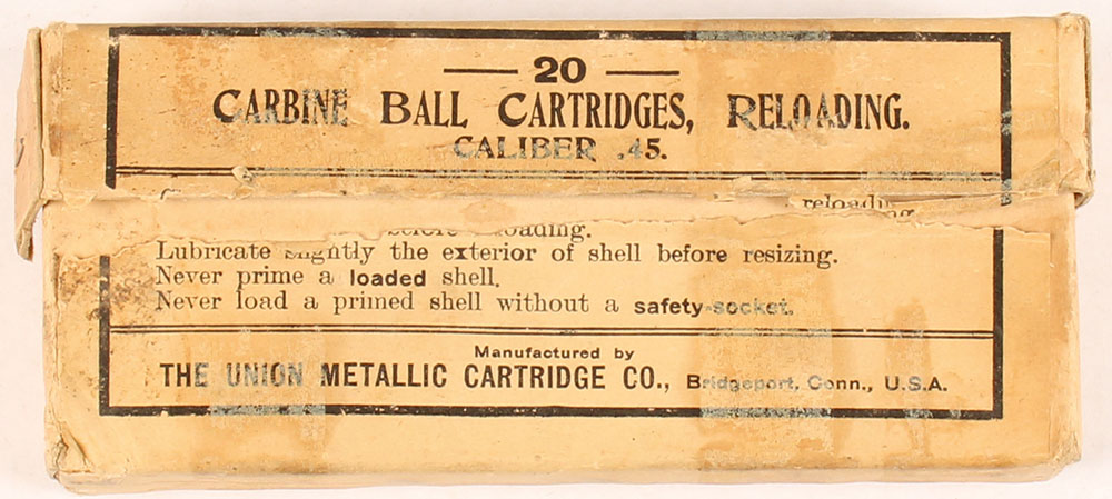 UMC, .45 Carbine Ball (.45-70), Reloading, Full, ''U.M.C. 45 GOVT'', 2pc, buff box & label with black print, box is solid with glue-repaired corner seams on the lid, old tape marks, & rub wear to the labels & edges/corners, ammo ranges from very good to good, some rounds have green corrosion. Grade: Very Good + - Value: 100 to 200