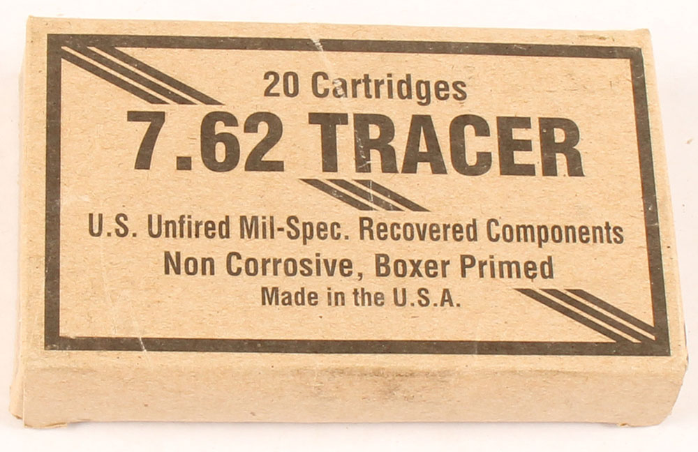 Talon MFG Co./Winchester, 7.62mm Nato Tracer (7.62x51mm), made from unused Mil-Spec components, Full, 20 Rd. box, 1pc, buff box with black print, box has rub wear, ammo is very good, orange tips mostly rubbed off. Grade: Excellent ++ - Value: 30 to 60