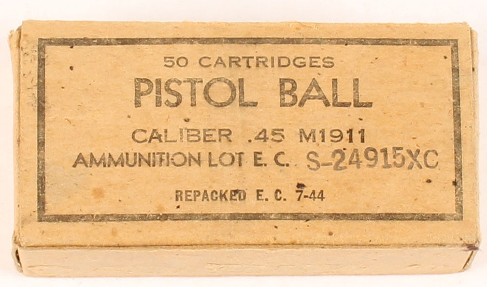 Evansville, .45 ACP M1911 Ball, 50 Rd. box, steel case, 1pc, Full, buff box with black print, box is solid with rub marks & handling wear, ammo is very good. Grade: Excellent - Value: 20 to 30