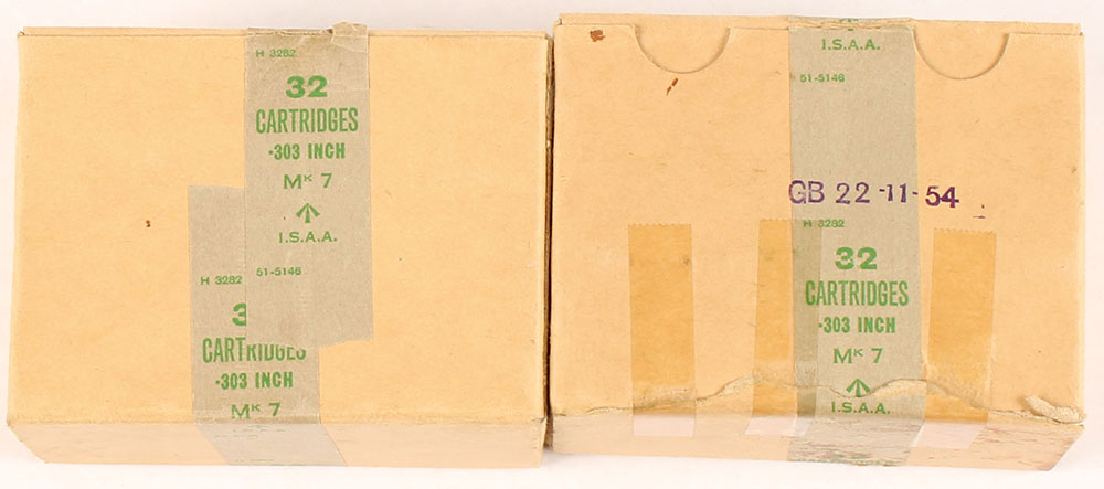 Lot of two, British, Greenwood & Batley. .303 Inch Mk 3 (.303 British), 32 Rd. boxes, both date stamped ''11-54'', (November 1954), both full, ''GB 54 7'' H/S, 1pc, buff boxes with gray label & green print, boxes are solid with handling wear, rub marks, & tape repairs on one box, ammo ranges from very good to fair, some cartridges have corrosion, ammo is corrosive. Grade: Very Good + - Value: 30 to 60