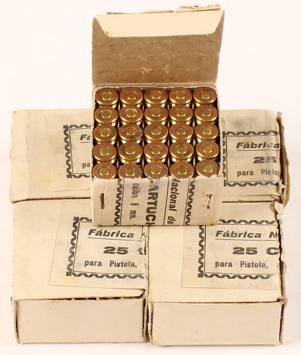 Lot of five, Fabrica Nacional de Toledo (Spanish), 9mm Parabellum (9x19mm), 25 count boxes, brass case, all full, ''F N T 1951'' H/S, white boxes with white & black labels, boxes are solid with rub wear & light age soiling, ammo is very good, possibly has corrosive primers. Grade: Very Good ++ - Value: 24 to 50
