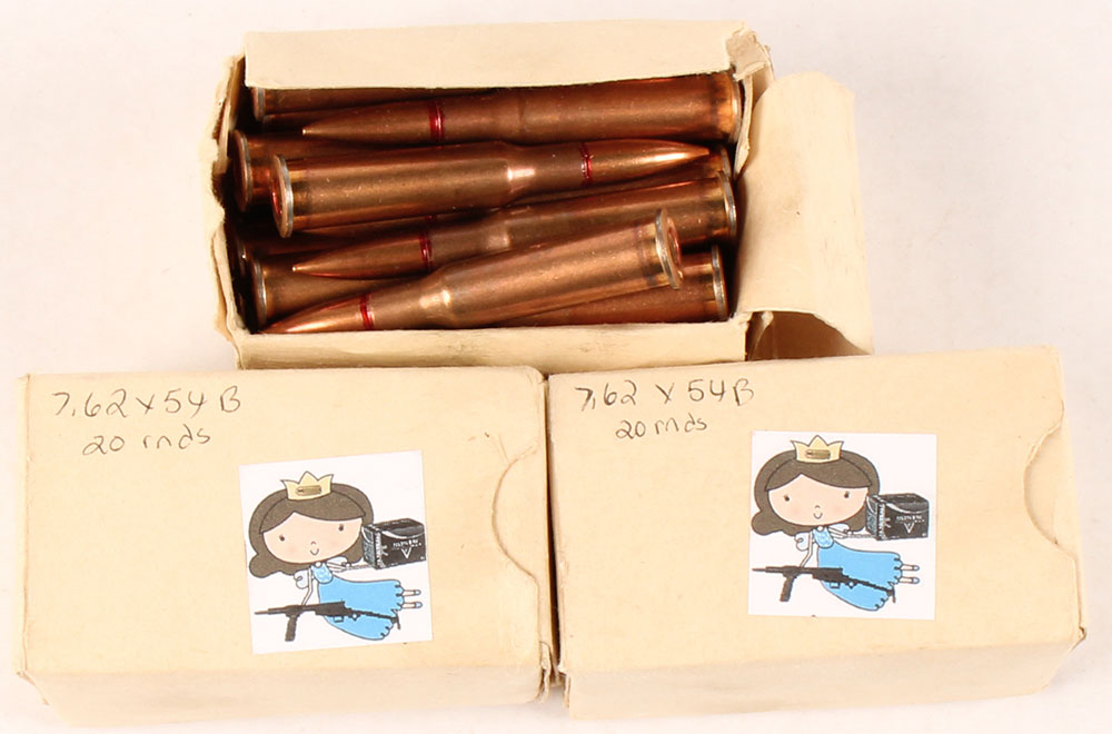 Lot of three, Bulgarian, 7.62x54mmR, copper washed steel case, 20 Rd. boxes, all full, ''10 81'' H/S, buff boxes with pen marks & stick, boxes have light rub wear, ammo is excellent, has corrosive primers. Grade: Excellent - Value: 30 to 60