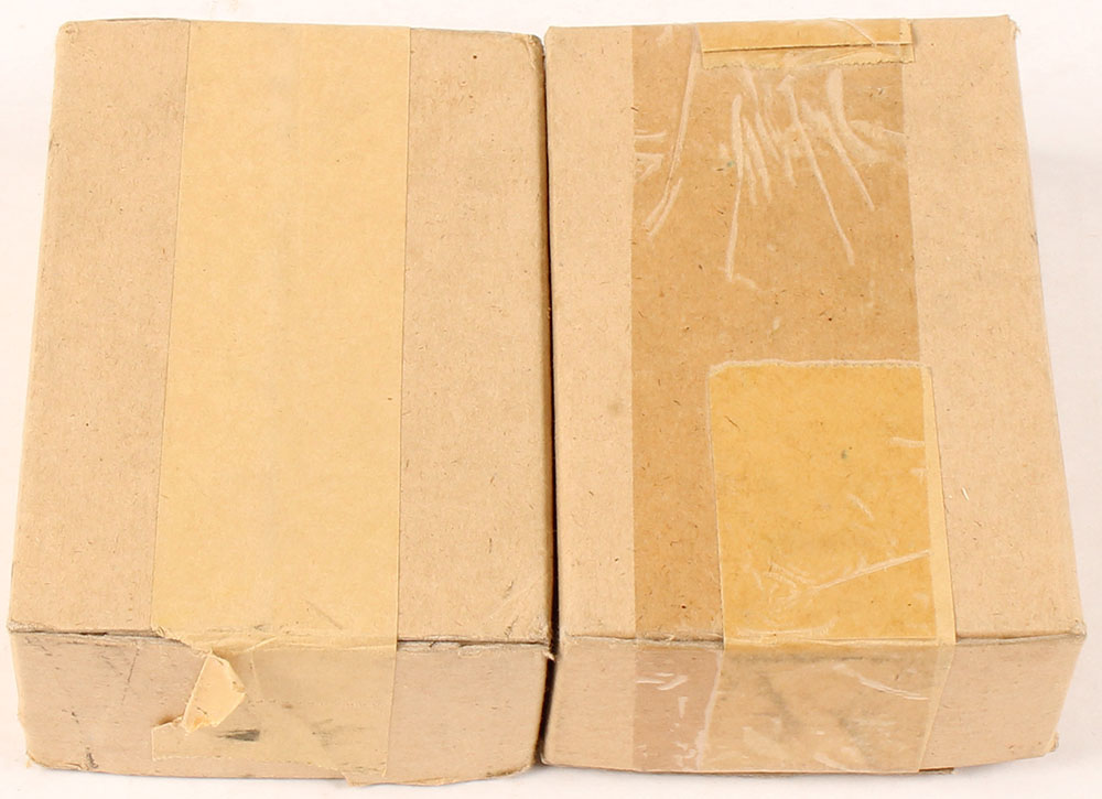Lot of two, Canadian, 8mm Mausr, 40 Rd. ammo boxes, H/S is marked ''MM 42 7.92'', marked 1942 but was actually made in the 50'-60's by Dominion for clandestine contracts for the CIA to use in the Caribbean & South America, Dominion probably did not want to get associated with whoever they were sending it to so made a fake/new H/S for these. Both Full one box SEALED, buff box & label with no markings, boxes have handling wear & rub marks, one has tape on it, ammo in open box is excellent. Grade: Excellent - Value: 40 to 80
