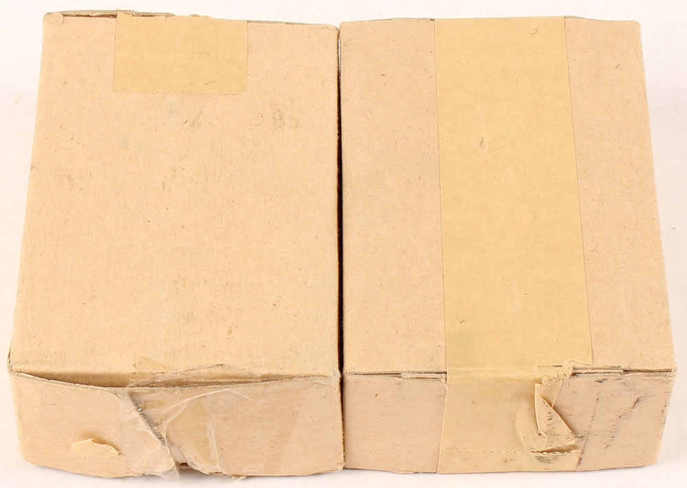 Lot of two, Canadian, 8mm Mausr, 40 Rd. ammo boxes, H/S is marked ''MM 42 7.92'', marked 1942 but was actually made in the 50'-60's by Dominion for clandestine contracts for the CIA to use in the Caribbean & South America, Dominion probably did not want to get associated with whoever they were sending it to so made a fake/new H/S for these. Both Full one box SEALED, buff box & label with no markings, boxes have handling wear & rub marks, one has tape on it, ammo in open box is excellent. Grade: Excellent - Value: 40 to 80