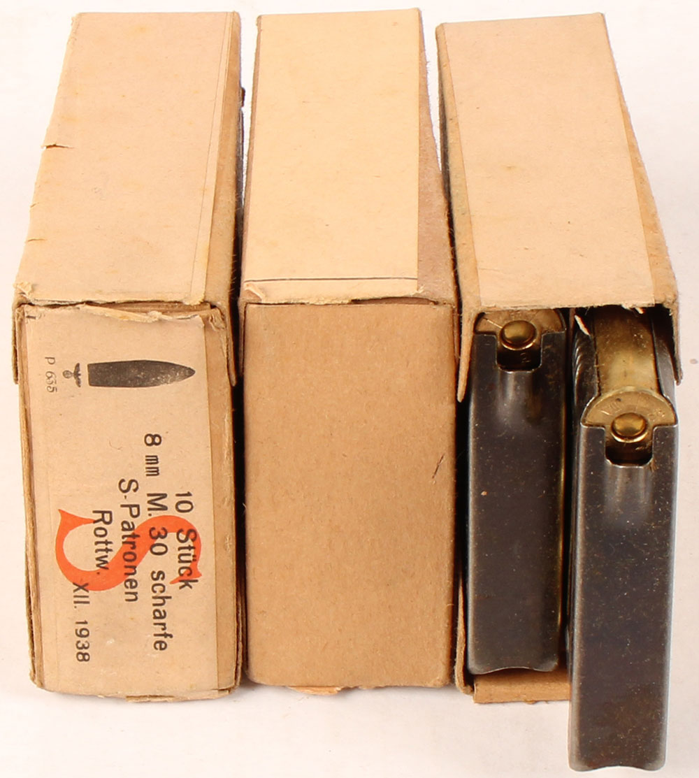Lot of three, Austrian, 8mm M.30 Scharfe S-Patronen (8x56mmR), 10 Rd. boxes, on 5 Rd. en-bloc clips, 1930's-40's dated, some Austrian & German H/S & marked clips, all Full, 2pc, boxes, buff boxes & label with black & red print, boxes have rub wear, ammo is very Good. Grade: Excellent - Value: 20 to 40