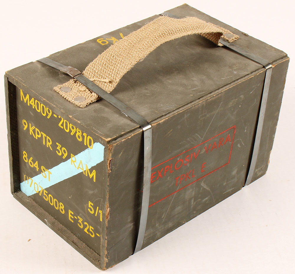 Swedish, KPTR M39 9mm (9x19mm), Training ammo, SEALED CASE, 864 Rds. Total, Gray/green painted wood crate with blue & yellow print, crate is solid with rub wear & scuff on sides & edges/corners. Metal bands & the carrying strap are intact. CAUTION, this ammo was designed to be used in Swedish submachine guns with a special barrel insert, the bullet is composite with a steel ball bearing inside, in a normal 9mm barrel when fired the composite bullet breaks up & the ball bearing can ding up the rifling as it goes down the barrel. Grade: Excellent - Value: 100 to 300