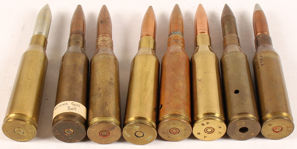 Lot of eight, US, .60 Caliber experimental heavy machine gun cartridges. One missing primer, rest have intact primers, two round have holes drilled on sides. Grade: Excellent - Value: 50 to 150