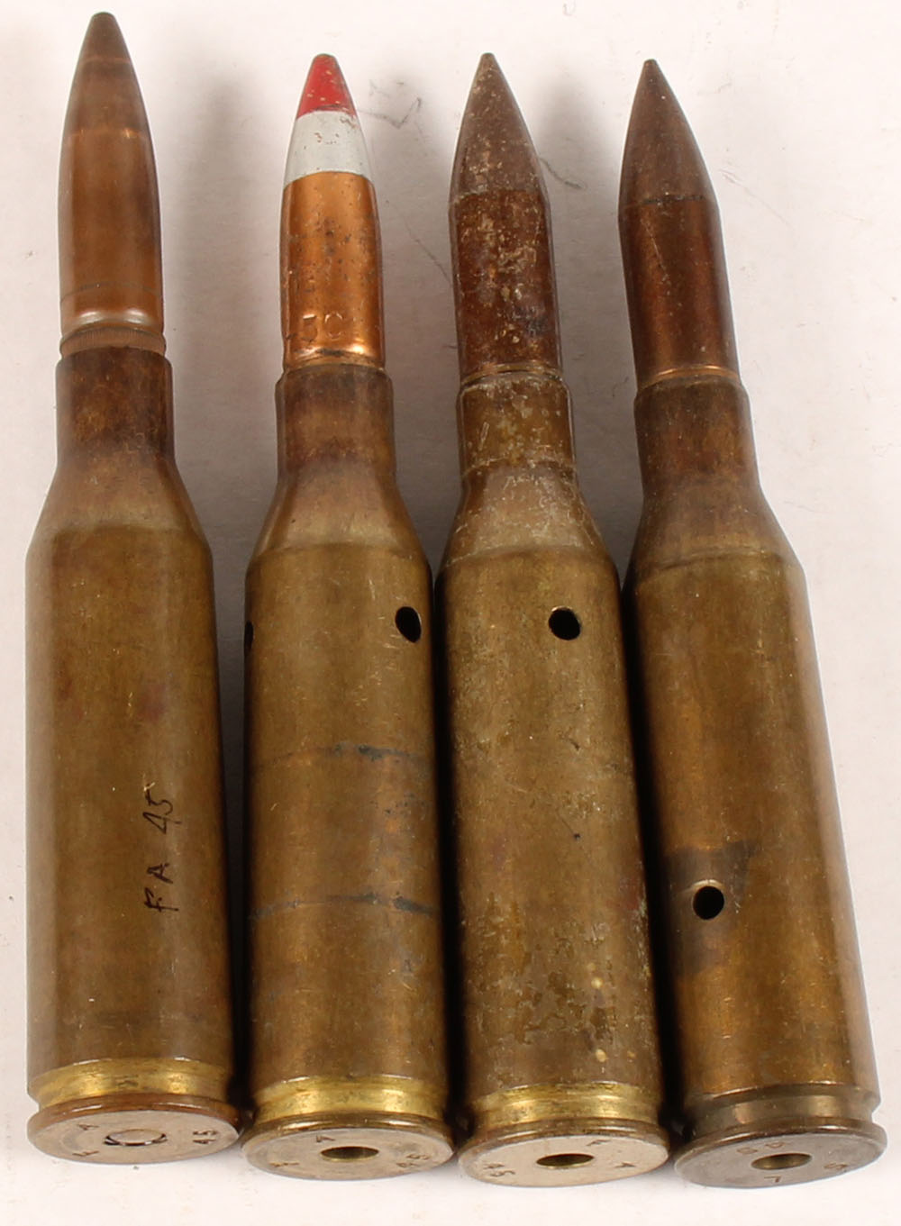 Lot of four, US, .60 Caliber experimental heavy machine gun cartridges. All have holes drilled in side, one has a intact primer, three ''FA 45'' H/S, one ''SL 45'' H/S. Grade: Excellent - Value: 50 to 100