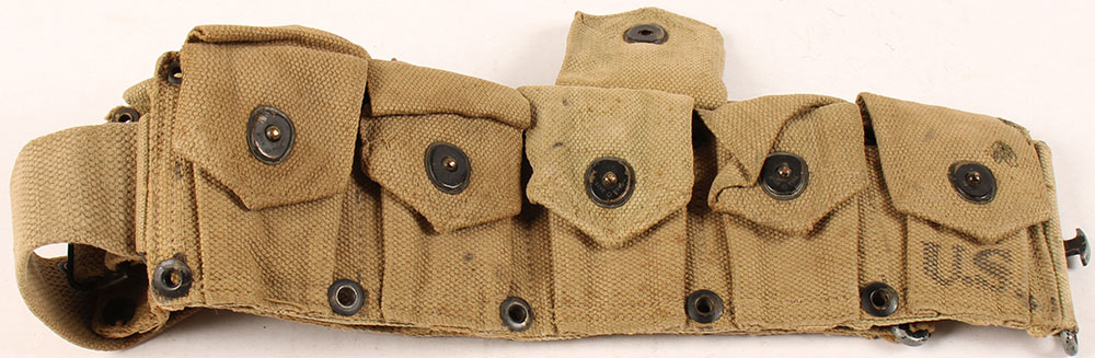US, Hinson MFG. Co., M1923 Cartridge Belt, Khaki, 10 cells that can hold either toe 5 Rd. stripper clips pf .30-06 for a Springfield 1903/03-A3, or one 8 Rd. Enbloc clips of .30-06 for a M1 Garand. MFG markings are almost worn illegible, date marking is illegible, but they were made in 1942 & 44. Stamped ''US'' on the first right side pouch. It has some small tears & sewn repaired tears, metal paint partial worn off buckle, belt has light stains. Pouches have a strap clip separator like the earlier M1910 cartridge belt. Grade: Very Good + - Value: 30 to 60