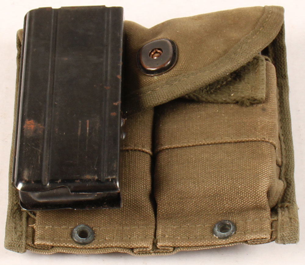 US, M1 carbine 15 Rd. magazine, two cell pouch, comes with two 15 Rd. M1 Carbine mags, ''U'', & ''UI'' in circle marked magazines respectively, Manufacture info on inside flap worn illegible, has pen markings & rust stains on inside of flap. Has belt loops. Brass parts have light corrosion. Magazines have scratch/wear marks & spots of rust. Grade: Very Good - Value: 20 to 60