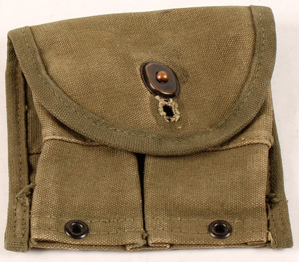 US, M1 carbine 15 Rd. magazine, two cell pouch, Manufacture info on inside flap is worn, has hole in flap as extra securing point for the stud, has some frayed seams & light rub wear, has belt loops. Grade: Very Good ++ - Value: 20 to 30