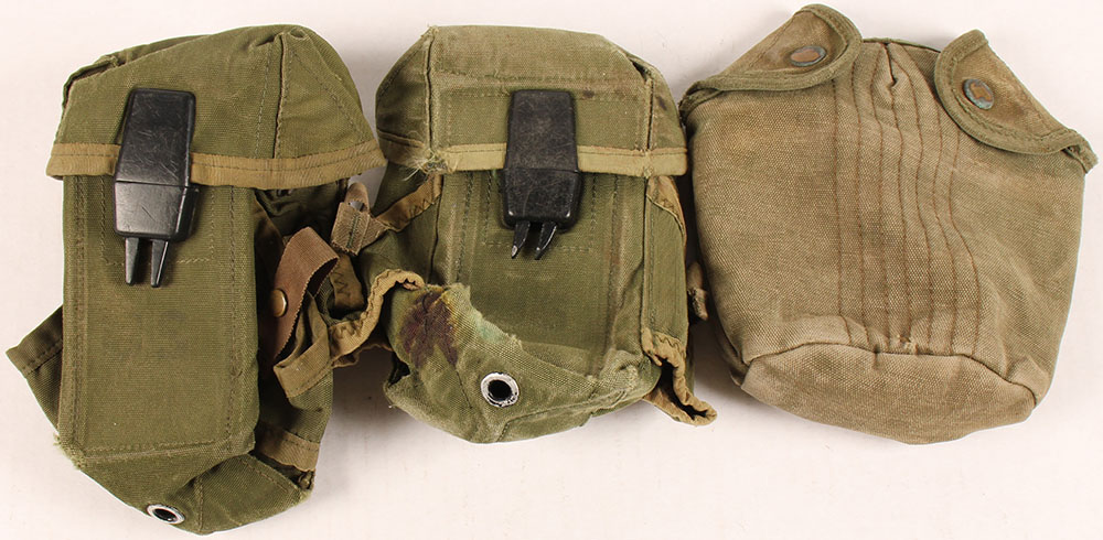 Lot of two, Nylon, LC1 Alice M16 Mag pouches, & one canvas canteen pouch with allice clips, mag pouches have room for three 30 Rds. M16/AR-15 mags with two side pouches for M67 frag grenades on each pouch. Pouches have pen marks & rub wear. Grade: Very Good - Value: 20 to 40