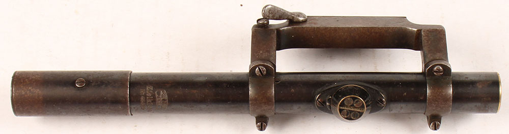 RARE!!, WW2, Carl-Zeiss Jena, Zielklein (target small) Nr. 46629 scope, with unmarked mount, commercial scopes like these were bought & used before more military models were made, some of them would be marked by the military & some would not be. German No.1 reticle, image is clear with no fogging or blurring. Scope body & mount has spots of thinned blue toning to a brown patina, with a light brown patina speckling across the metal. Grade: Very Good ++ - Value: 500 to 800