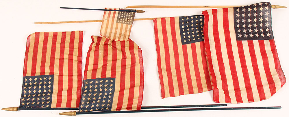 Lot of five, US 48 Star flags, this was the Flag used during both WW1 & WW2 from 1912 till 1959. Flags have age soiling/stains, all small varying sizes, one flag is held onto stick by one staple. Grade: Very Good - Value: 20 to 60