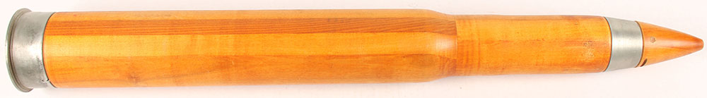 US, WW2 Navy 3'' wooden practice dummy shell, Mk.6, 1944 dated, ''HMC'', ''BFT'', ''329486'', & ''50CAL'' marked on H/S. Grade: Excellent + - Value: 100 to 200