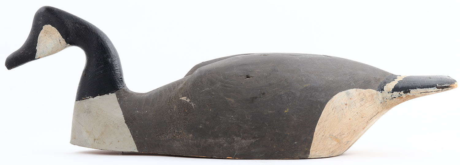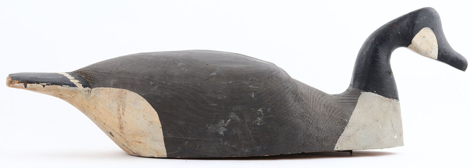Early Canada Goose by Jim Gatreau, Losier Settlement in New Brunswick Canada, circa 1950's, no eyes, hollow wood, original paint, structurally excellent, 23'' OAL. Grade: Excellent - Value: 100 to 400