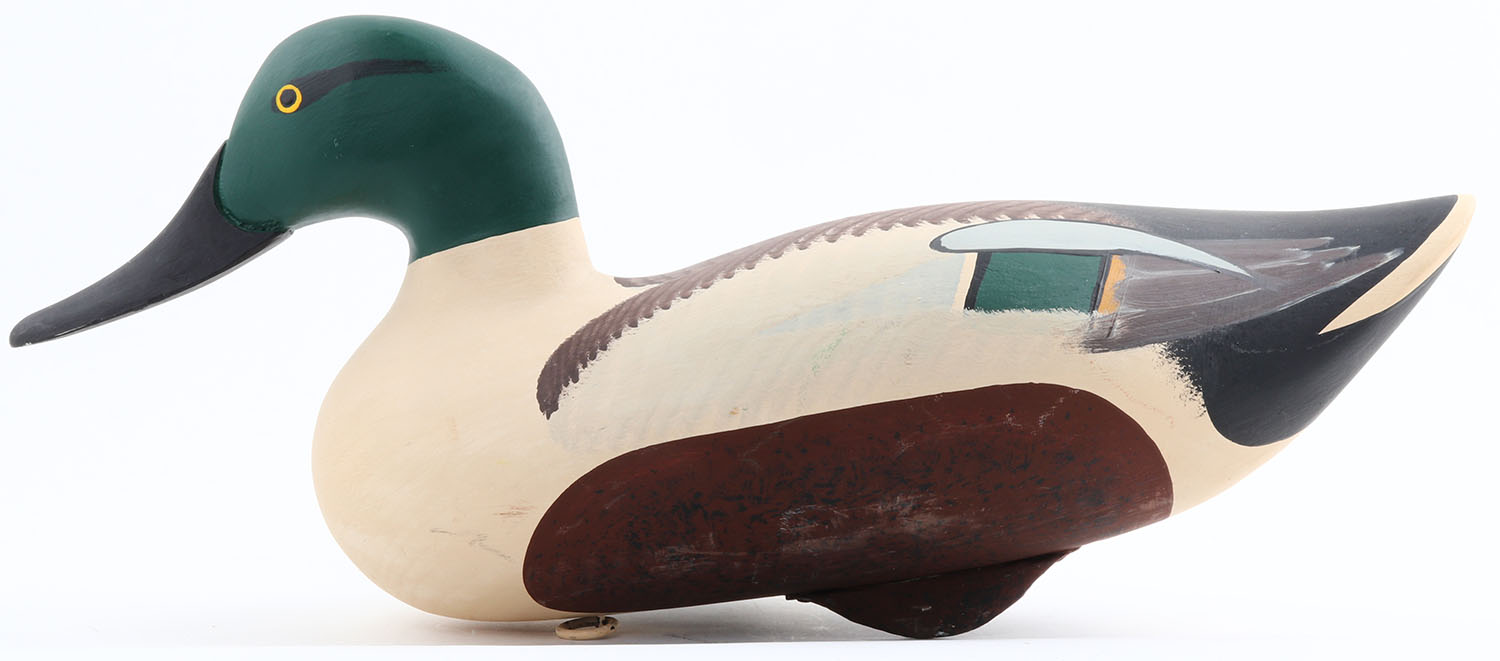 Shoveler Drake by David Walker, MD, painted eyes, solid wood, original paint, structurally excellent, branded on bottom ''WALKER'', 17''. Grade: Excellent ++ - Value: 40 to 80