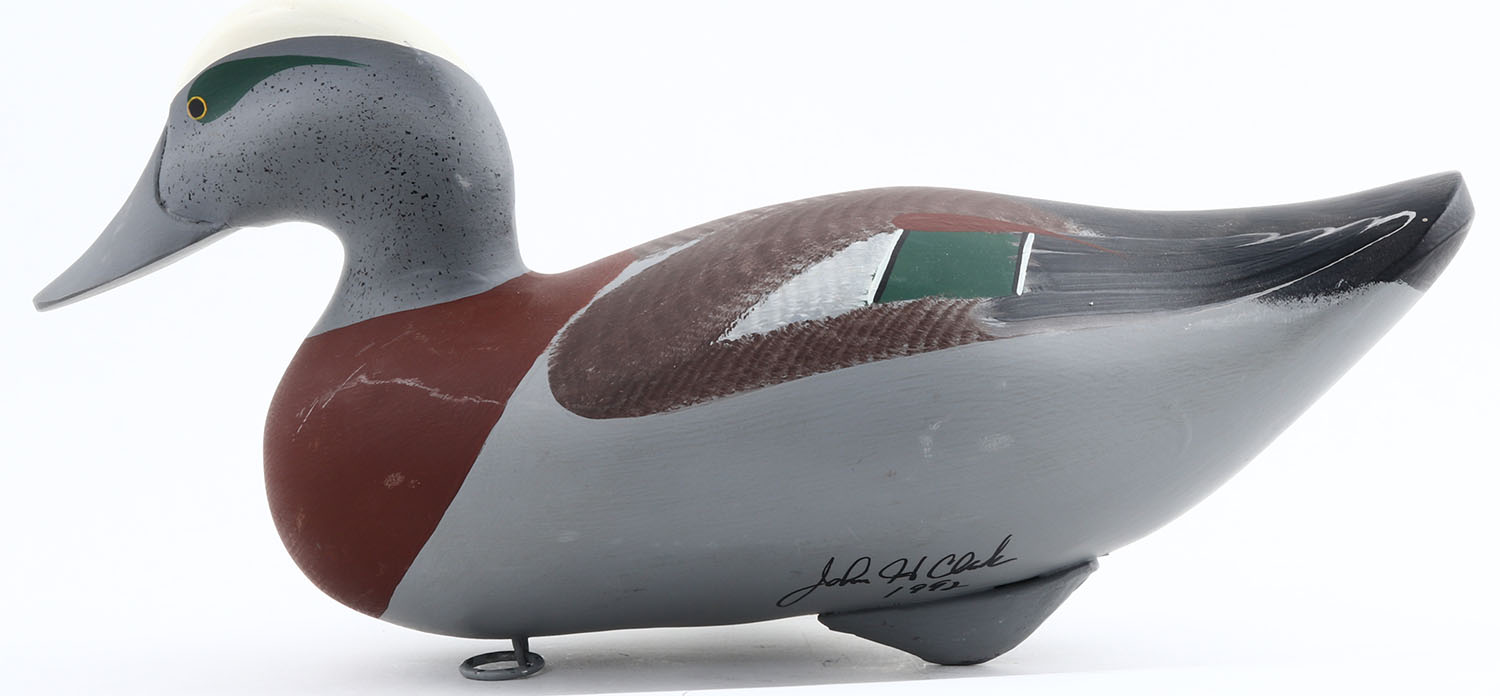 Widgeon Drake by John H. Clark, Havre De Grace, MD, painted eyes, solid wood, original paint, structurally excellent, signed on bottom, 14 1/2'' OAL. Grade: Excellent ++ - Value: 40 to 80