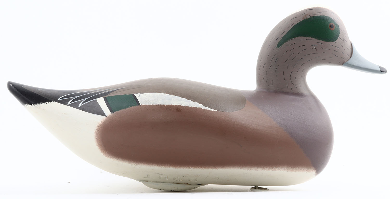 Widgeon Drake by Bryan Bodt, Churchville, MD, painted eyes, hollow wood, original paint, structurally excellent, branded BODT on bottom & signed, 14 1/2'' OAL. Grade: Excellent ++ - Value: 30 to 60
