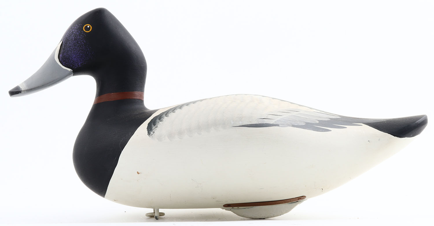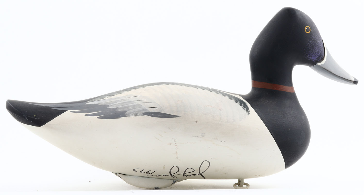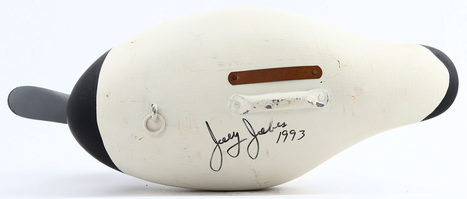 Bluebill Drake by Joey Jobes, Havre De Grace, MD , painted eyes, solid wood, original paint, copper tag on bottom with name, structurally excellent, 15 1/2'' OAL. Grade: Excellent ++ - Value: 40 to 100
